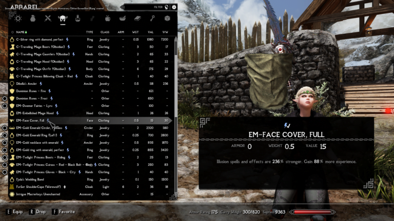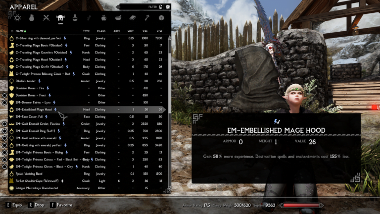 - Embellished Mage Hood – Gain 58% more experience. Destruction and enchantments cost 155% less.