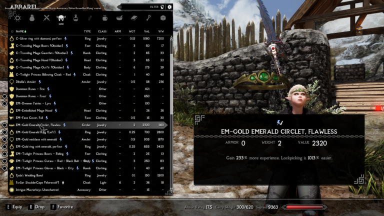 - Gold Emerald Circlet, Fawless – Gain 233% more experience. Lockpicking is 1013% easier.