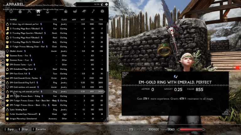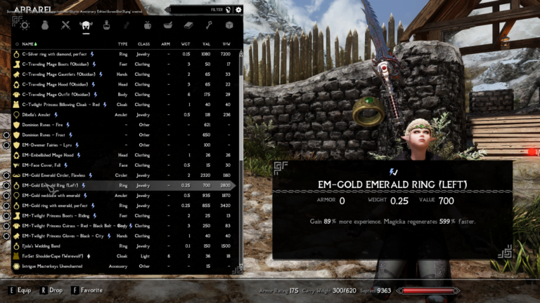 - Gold Emerald Ring (Left) – Gain 89% more experience. Magicka regenerates 599% faster.