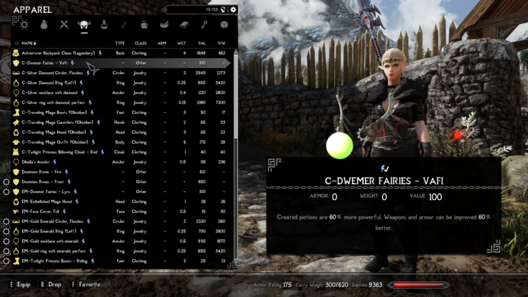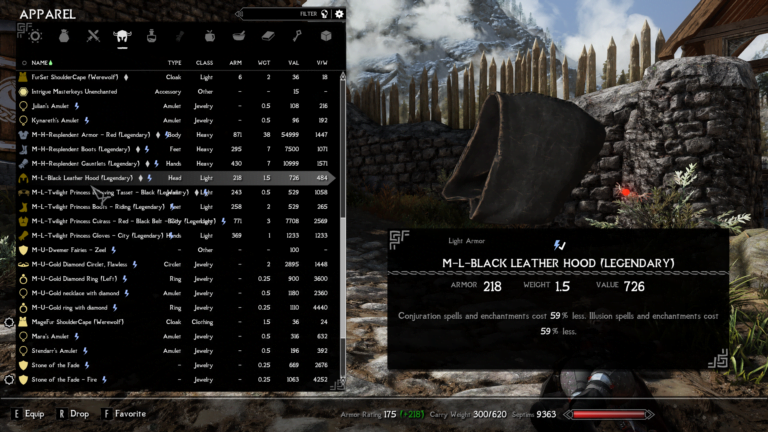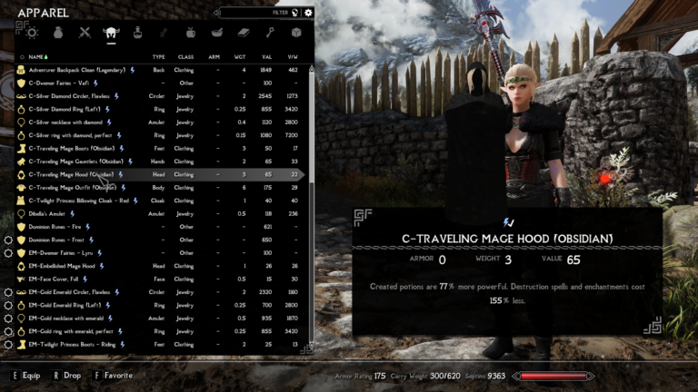 - Traveling mage hood – Created potions are 77% more powerful. Destruction spells and enchantments cost 155% less.