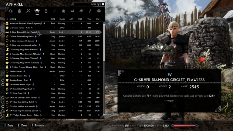 - silver diamond circlet – Created potions are 59% more powerful. Destruction spells and effects are 623% stronger.