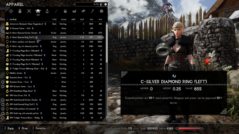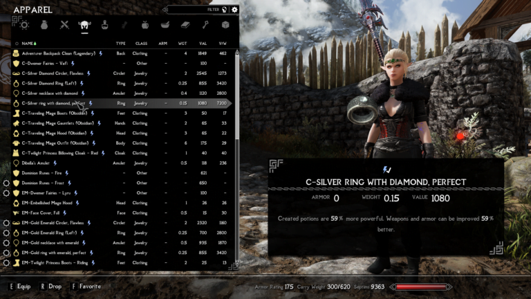 - silver ring with diamond – Created potions are 59% more powerful. Weapons and armor can be improved 59% better.