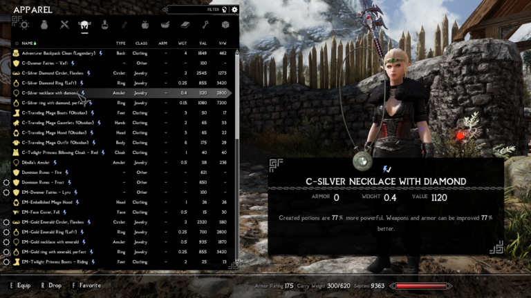 - silver necklace with diamond – Created potions are 77% more powerful. Weapons and armor can be improved 77% better.