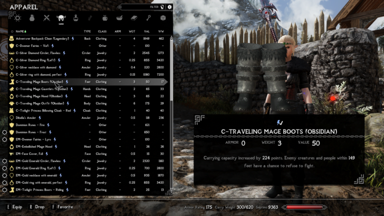 - Traveling mage boots – Carrying capacity incresed by 224 points. Enemy creatures and people within 149 feet have a chance refuse to fight.