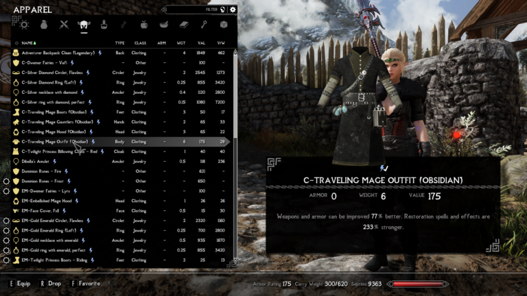 - Traveling mage outfit – Weapons and armor can be improved 77% better. restoration spells and enchantments cost 233% less.