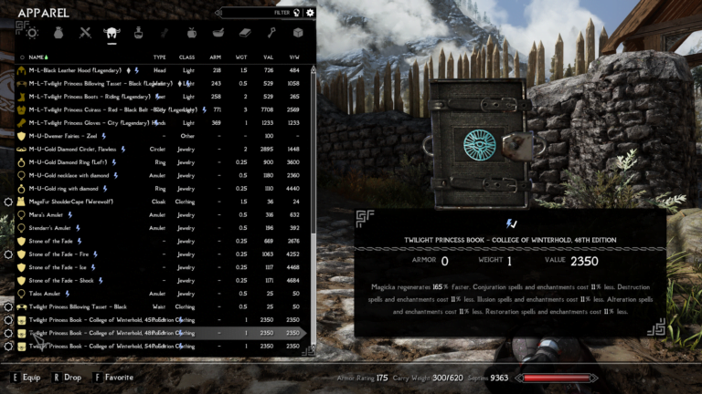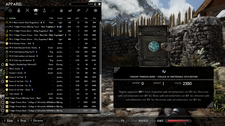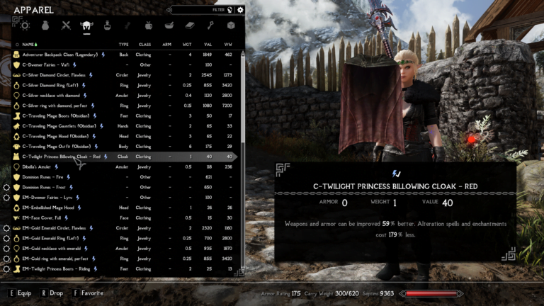 - Twighlight Princess billowing cloak – Weapons and armor can be improved 59% better. Alteration spells and enchantments cost 179% less.