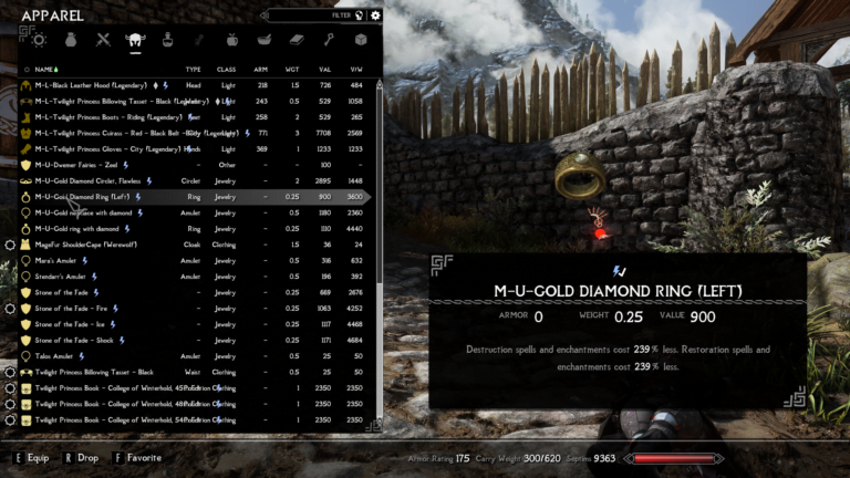 - Gold Diamont Ring (LEFT) – Destruction spells and enchantments cost 239% less. Restoration spells and enchantments cost 239% less.
