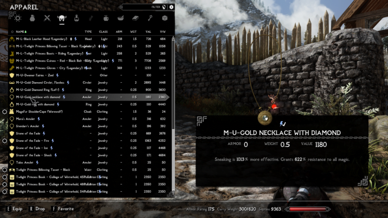 - Gold Necklace with Diamond – Sneaking is 1013% more effective. Grants 622% resistance all magic.