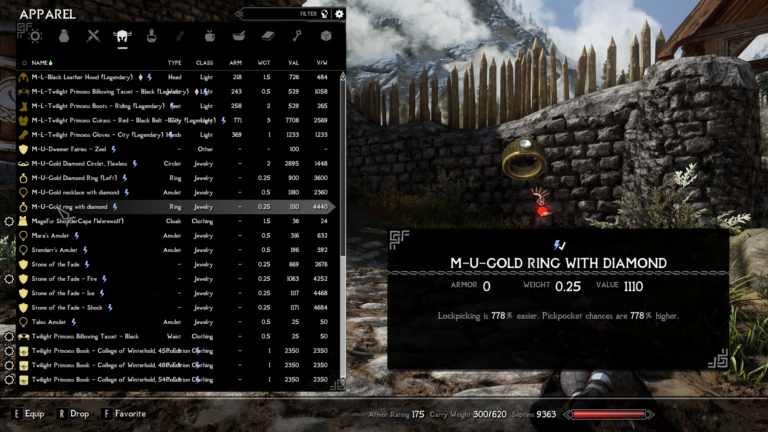 - Gold Ring with Diamond – Lockpicking is 778% easier. Picpocket chances are 778% higher.